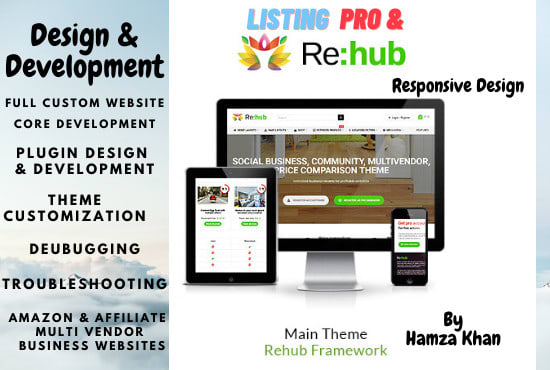 I can offer you Design, Customization & Optimization services for WordPress Websites using one of the following Themes: Rehub, Listingpro, My-listing, Listify, Townhub, Wilcity, Adforest, CityBook, List&Go,Carrerfy.